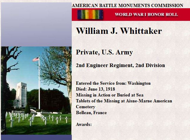 William Whittaker was killed at Belleau Wood, Chateau-Thierry, doing his duty with the engineers which acted in the capacity of infantry besides performing their own work of bringing in ammunition and provisions for the marines. They releived the marines of a part of the front. It was the action at Chateau-Thierry which broke the Hun morale and begun the last great victorious drive of the allies.